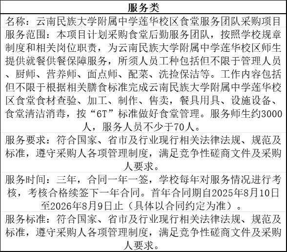 二、项目名称:云南民族大学附属中学莲华校区食堂服务团队采购项目。