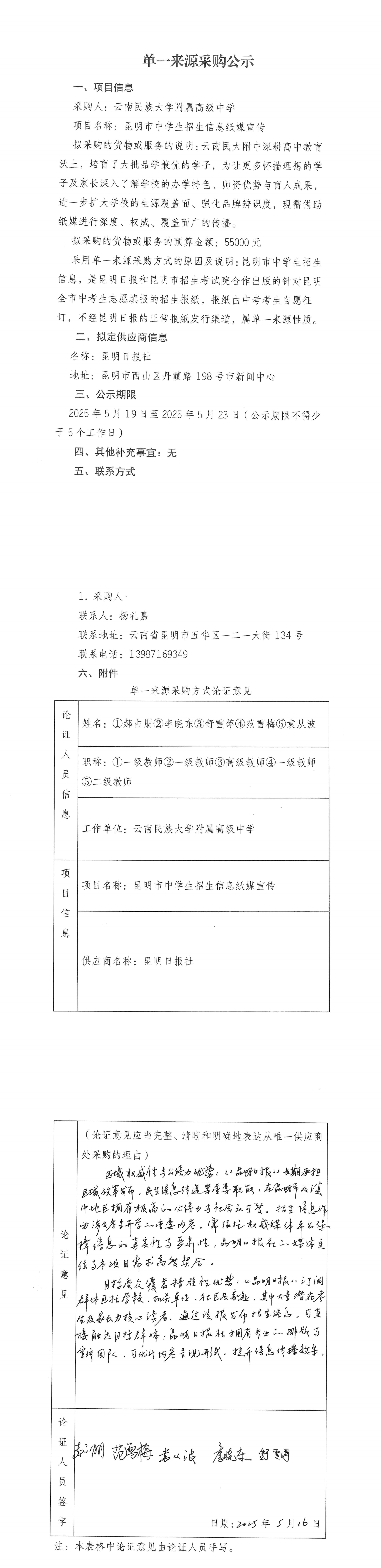 云南民族大学附属高级中学昆明市中学生招生信息纸媒宣传项目单一来源采购公示