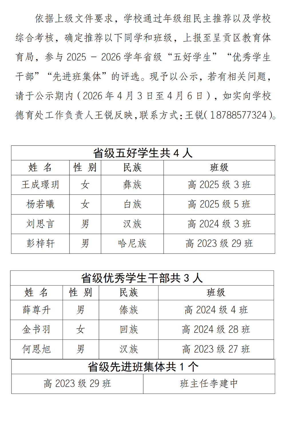 云南民族大学附属高级中学2026年云南省“五好学生”“优秀学生干部”“先进班集体”推荐名单公示