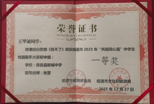 彝良县校园歌手大赛的余韵尚未消散,“美育浸润”帮扶校园美育建设的丰硕成果再传捷报。王华迪同学在彝良县县级校园歌手大赛斩获一等奖后,不负众望、砥砺前行,奔赴巧家县参加全市校园歌手大赛总决赛,凭借婉转悠扬的歌声、稳定出色的舞台表现,从众多选手中脱颖而出,成功摘得市级一等奖的桂冠!