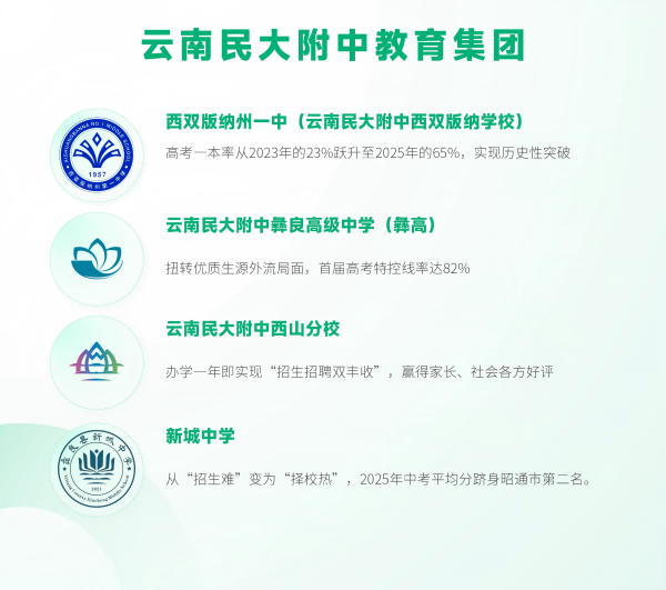 截至2025年,集团已成功在西双版纳、彝良、昆明西山区合作帮扶4所学校。各校在招生规模、教学质量、社会声誉等方面均实现历史性突破:云南民大附中彝良高级中学扭转优质生源外流局面,首届高考特控线率达82%;云南民大附中西双版纳学校(西双版纳州第一中学)高考一本率从2023年的23%跃升至2025年的65%,实现历史性突破;云南民大附中西山分校办学一年即实现“招生招聘双丰收”,赢得家长、社会各方好评;新城中学从“招生难”变为“择校热”,2025年中考平均分跻身昭通市第二名。这些成果不仅彰显了集团教育帮扶的实践力量,更成为新时代边疆民族地区教育振兴的生动注脚。