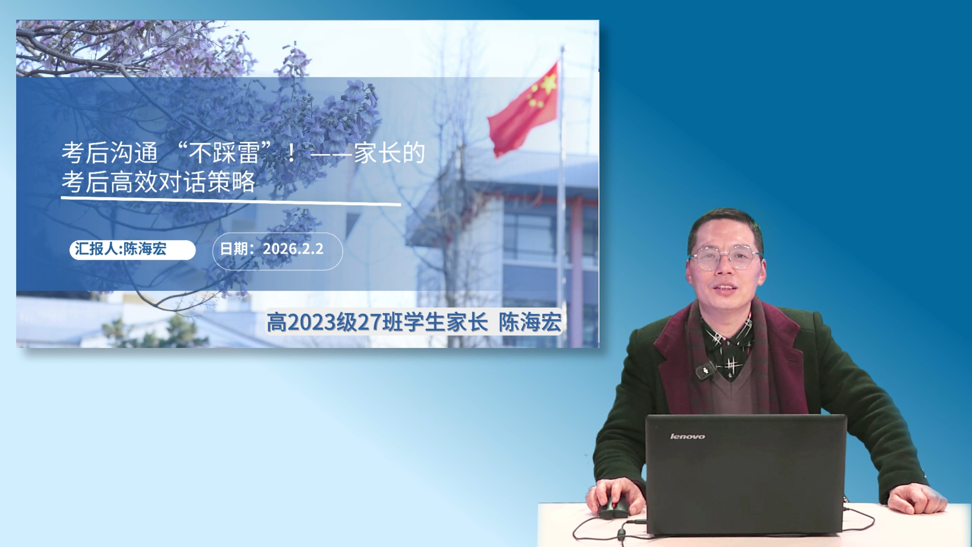 本期家长讲堂交流活动中,学生家长陈海宏先生围绕考后亲子沟通分享了独到见解。他指出,考后沟通是开展亲子深度互动的重要契机,需以理解为基础、以支持为核心、以成长为目标,切勿将目光单纯聚焦于考试分数。家长首先要重塑自身心态,放下对分数的执念,接纳孩子的个体差异与不完...