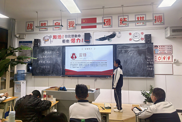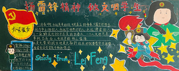 各班级积极开展学雷锋主题班会,师生共同学习雷锋先进事迹,开展“新时代如何学雷锋”主题讨论,并分享身边的学雷锋榜样和事迹。与此同时,全校各班级参与的“学雷锋・树新风,争做时代好少年”黑板报设计评比活动顺利开展,各班板报紧扣主题、图文并茂,将雷锋精神与青春风貌融入笔墨色彩,营造了浓厚的学雷锋校园氛围。
