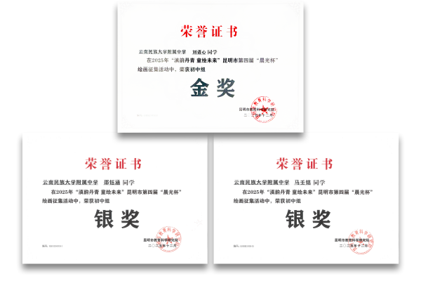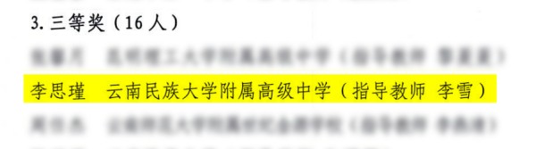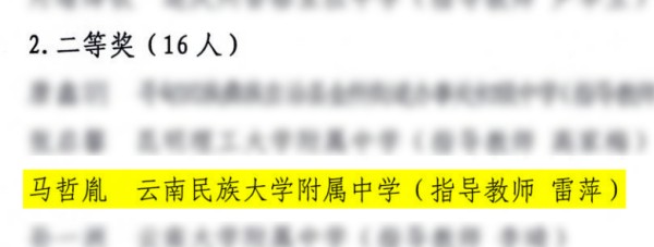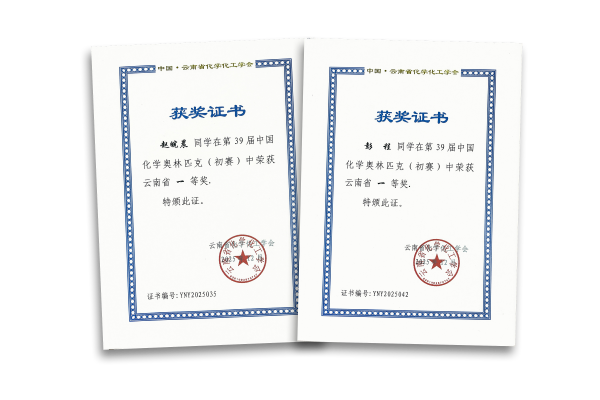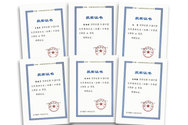 一、第39届中国化学奥林匹克(初赛):国家级二等奖:马子鉴 王萧然 国家级三等奖:陈冠燃 李沛辑;省级一等奖:赵皖晨 彭程;省级二等奖:陈柏同 和贤 蒋晓宇 李雨珂 刘羽翔 马子鉴 王胤杰;省级团体三等奖:云南民族大学附属高级中学