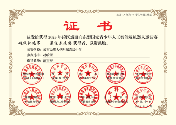 九、2025年跨区域面向东盟国家青少年人工智能及机器人邀请赛(省级赛区):赵峻翌 超级轨迹赛 最佳表现奖