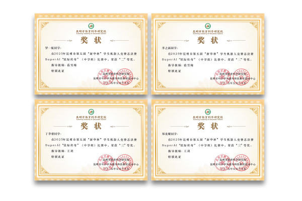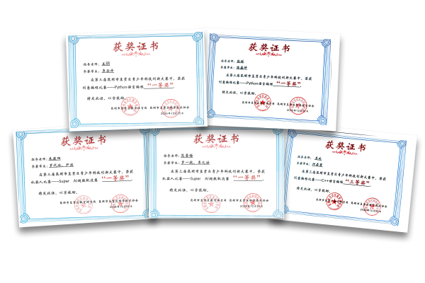 十三、第三届昆明市呈贡区青少年科技创新大赛:Python语言编程比赛:一等奖:陈盛坤、李函泽;二等奖:夏梓然;Super AI 超级轨迹赛:一等奖:罗代冰、罗一航;二等奖:程一鹏、周一、李浩铭;无人机比赛个人飞行赛中学竞赛组:二等奖:宋纪彤、吴开宇、王雅溪