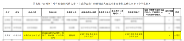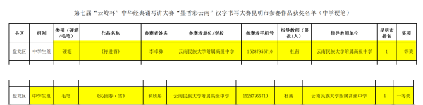十九、第七届“云岭杯”中华经典诵写讲大赛“墨香彩云南”汉字书写大赛、“书香彩云南”经典诵读大赛汉字书写大赛:中学毛笔一等奖:和欣彤;中学硬笔一等奖:李卓彝;经典诵读大赛:一等奖:陈旖诺