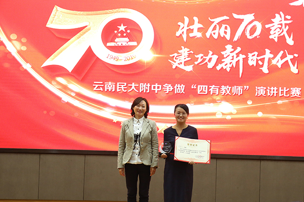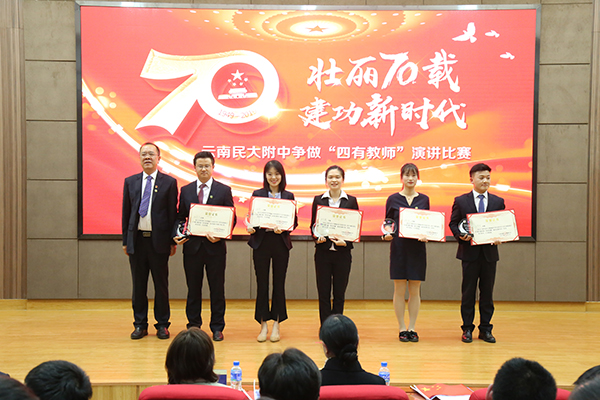 为激励教师争做“有理想信念、有道德情操、有扎实学识、有仁爱之心”的好老师,9月29日晚,云南民族大学附属中学举行争做“四有”教师演讲比赛,以教育者的情怀为祖国70华诞献礼。