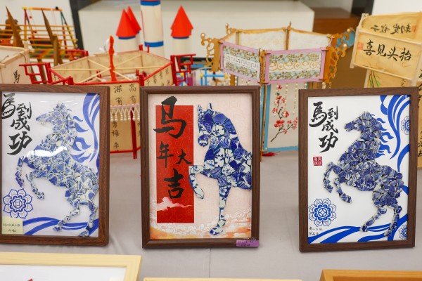 结合多个传统节日民俗特色,同学们化身小小非遗体验者,用传统手艺制作出灯笼、剪纸等充满节日韵味的作品,将“马到成功”“马年大吉”的美好寓意融入创作,巧用青花瓷碎片精心制作镶嵌画。