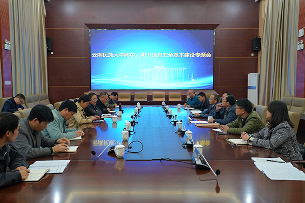 11月14日,云南民族大学党委副书记刘荣、副校长高飞在附中召开信息安全建设专题会。云南民族大学国有资产管理处处长颜明、安全保卫处处长吕岳、信息与网络中心主任高明虎、基建处副处长孙利东、教育发展有限公司副总经理印仁树等陪同调研,民大附中校长李兴富、党委书记李代鹏及民大附小领导等参加调研工作会。