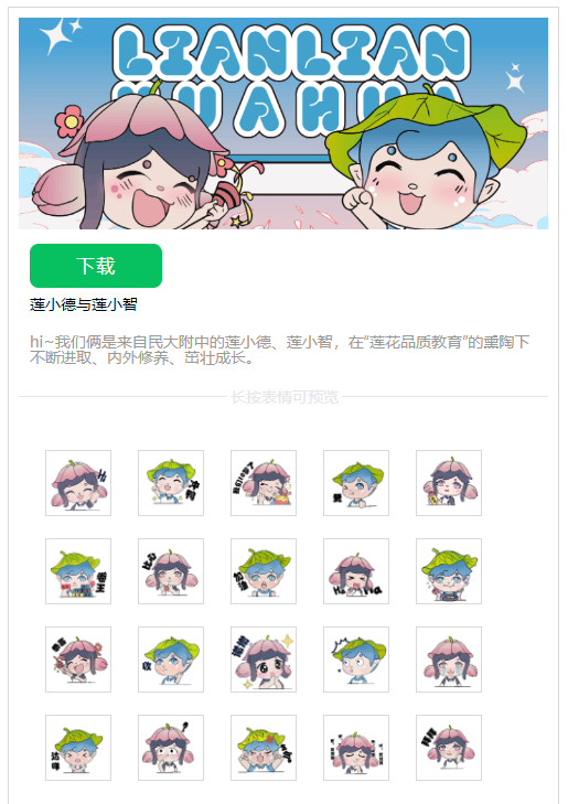 设计理念:以学校办学定位“莲花品质教育”进行拟人化设计,融入荷花的元素;“莲小德”名称取自“德行天下,学贯古今”的校训,形象以绿色为主,头戴荷叶帽,彰显男孩充满活力,清爽俊逸的特征;“莲小智”名称取自“德智并修,知能共进”的学风,形象以粉色为主,头戴荷花帽,彰显女孩活泼灵动,温暖明媚的形象;身着民附校服,以荷叶、荷花为主要形态,蕴含新生和希望的深刻内涵,寓意着民附学子在“莲花品质教育”的熏陶下不断进取、内外修养、茁壮成长。