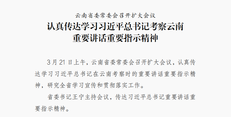 3月21日上午,云南省委常委会召开扩大会议,认真传达学习习近平总书记在云南考察时的重要讲话重要指示精神,研究全省学习宣传和贯彻落实工作。省委...